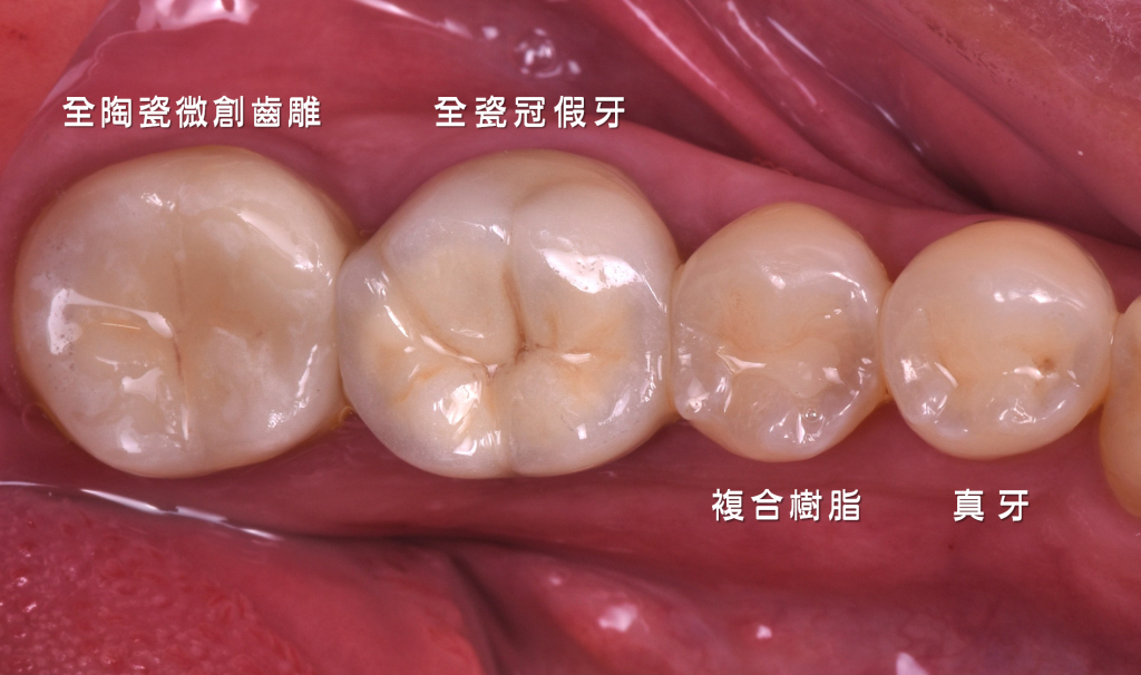 照片由左至右分別為微創齒雕、全瓷冠假牙複合樹脂補牙、真牙,選擇適合補牙的材料,可以得到既美觀又耐用的治療成果。