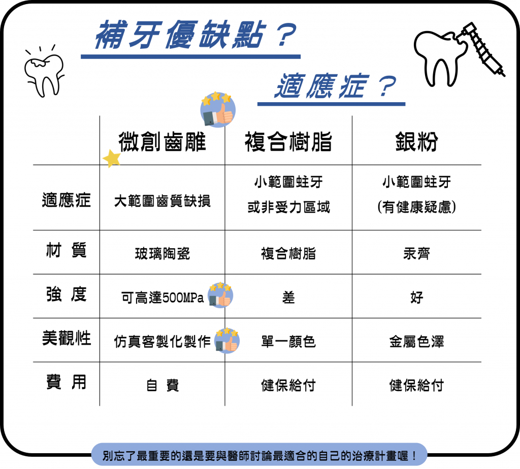 上表列出這微創齒雕、樹脂、銀粉的優缺點以及適應症,希望能讓大家更能了解各種補牙的材料的特性,記得與醫師討論後,來選擇最適合自己的治療方式喔!
