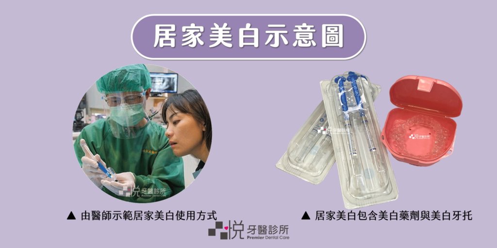 在診所製作客製化的美白牙托,在家依照醫師指示自行添加美白藥劑至牙托,相對於冷光美白較溫和,並於睡眠時配戴,持續配戴2至3周會有顯著變化,需定期回診追蹤。