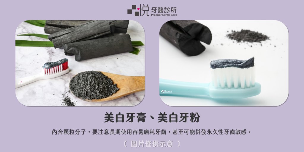 長期使用美白牙膏、美白牙粉,容易磨耗牙齒,造成牙齒表面磨損,產生永久性牙齒敏感;美白牙貼、美白筆則無法完整包覆牙齒、保護牙齦,容易造成美白不均勻,造成牙齦刺激發炎。