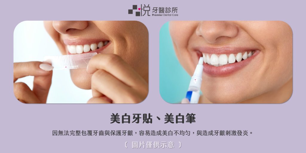 美白牙貼、美白筆主要是透過的問題是無法完整包覆牙齒與保護牙齦,容易造成美白不均勻,與造成牙齦刺激發炎。