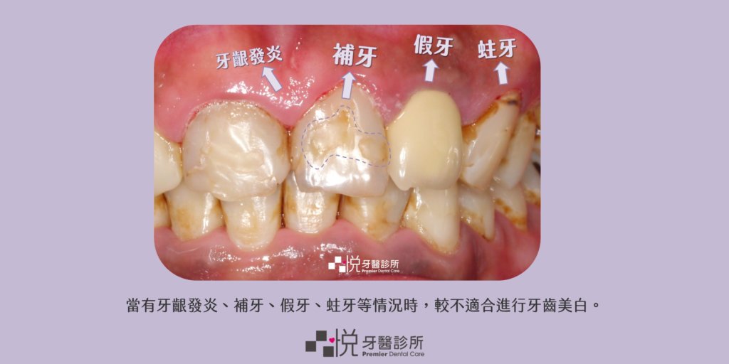 承上段,若有牙齦發炎、敏感性牙齒、有許多補牙(樹脂)、美觀區有許多贋復牙冠(假牙)的人,須由牙醫師評估,可能較不適合進行牙齒美白,並且能減少美白牙齒後的預後不良機會。