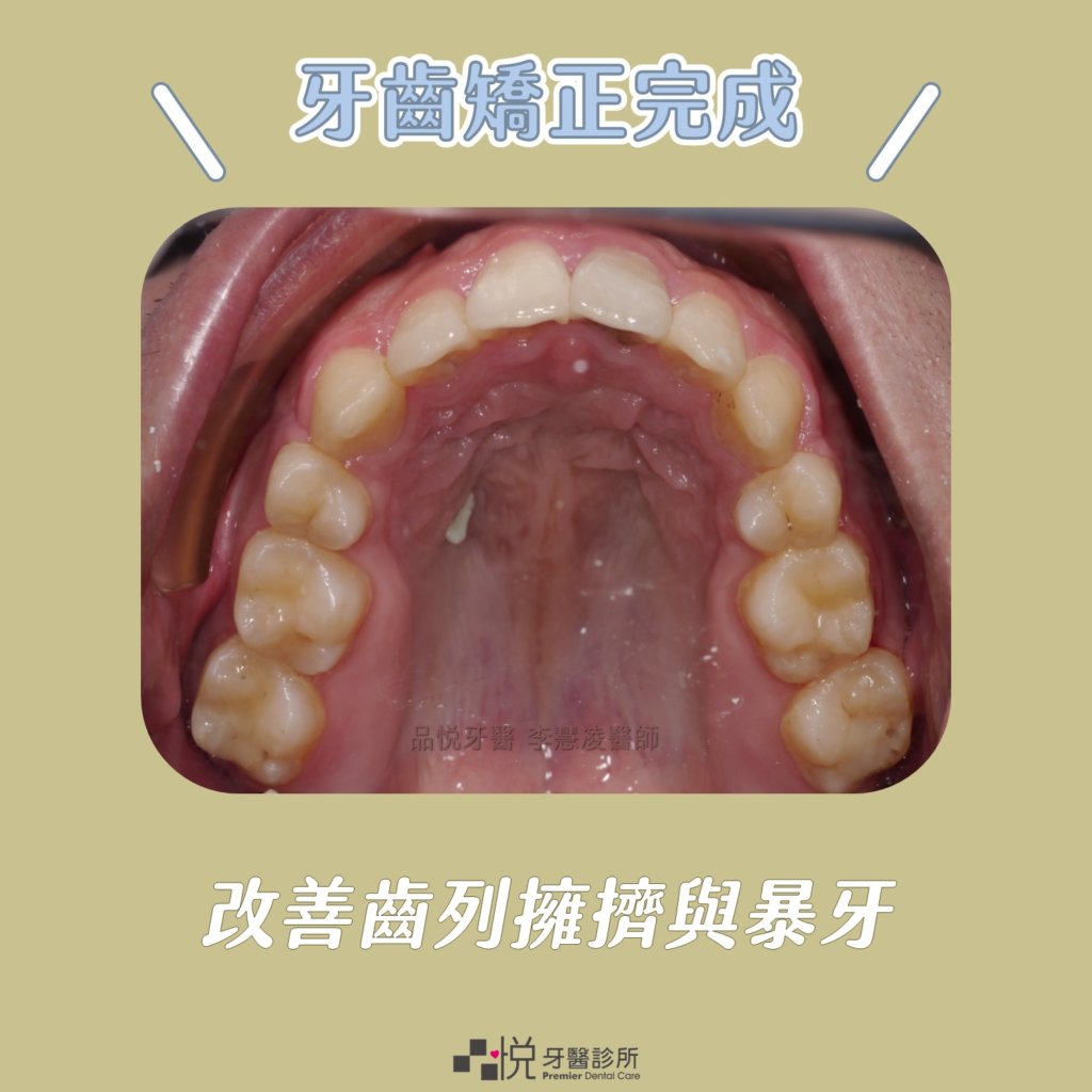 以本案例來說,原本有戽斗問題合併中線偏移許多,搭配矯正拔牙(右下排單顆牙齒)後,完成牙齒矯正獲得明顯的改善!