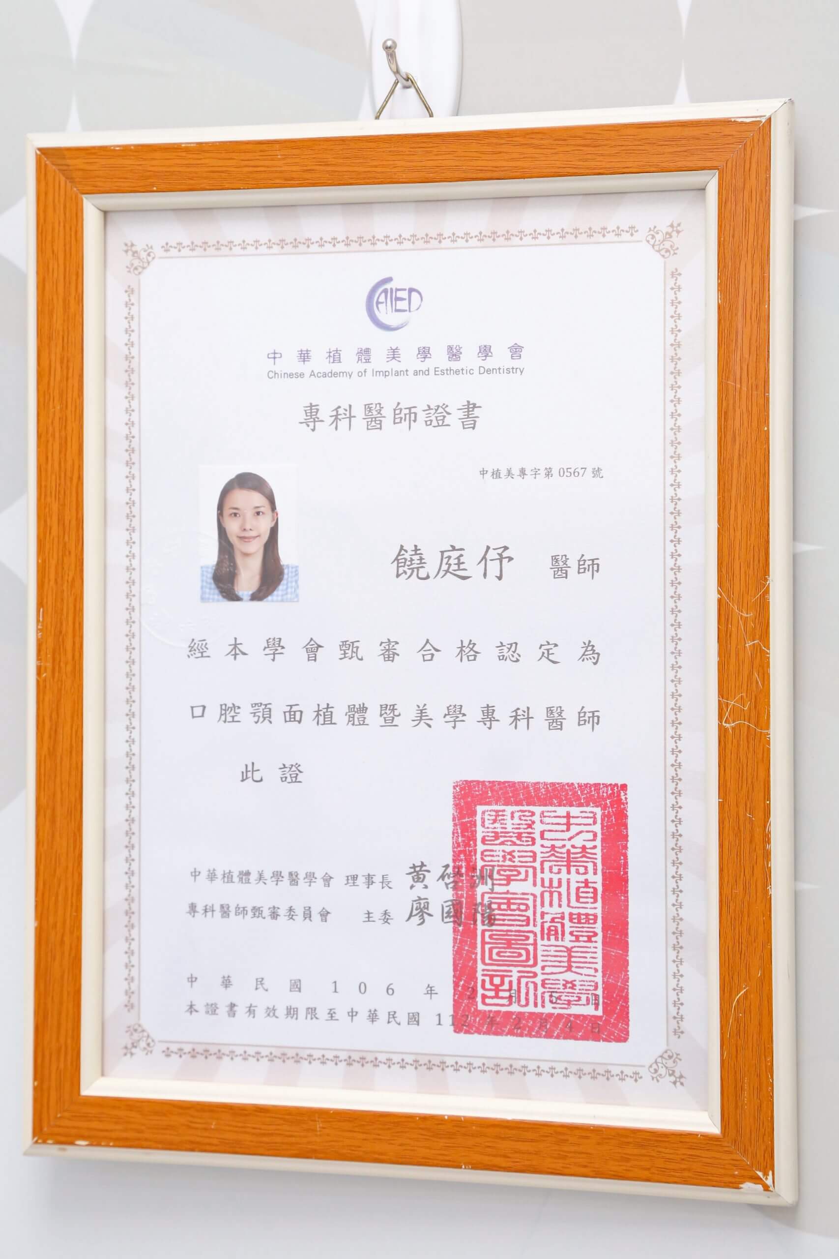 饒庭伃醫師是口腔顎面植體暨美學專科醫師