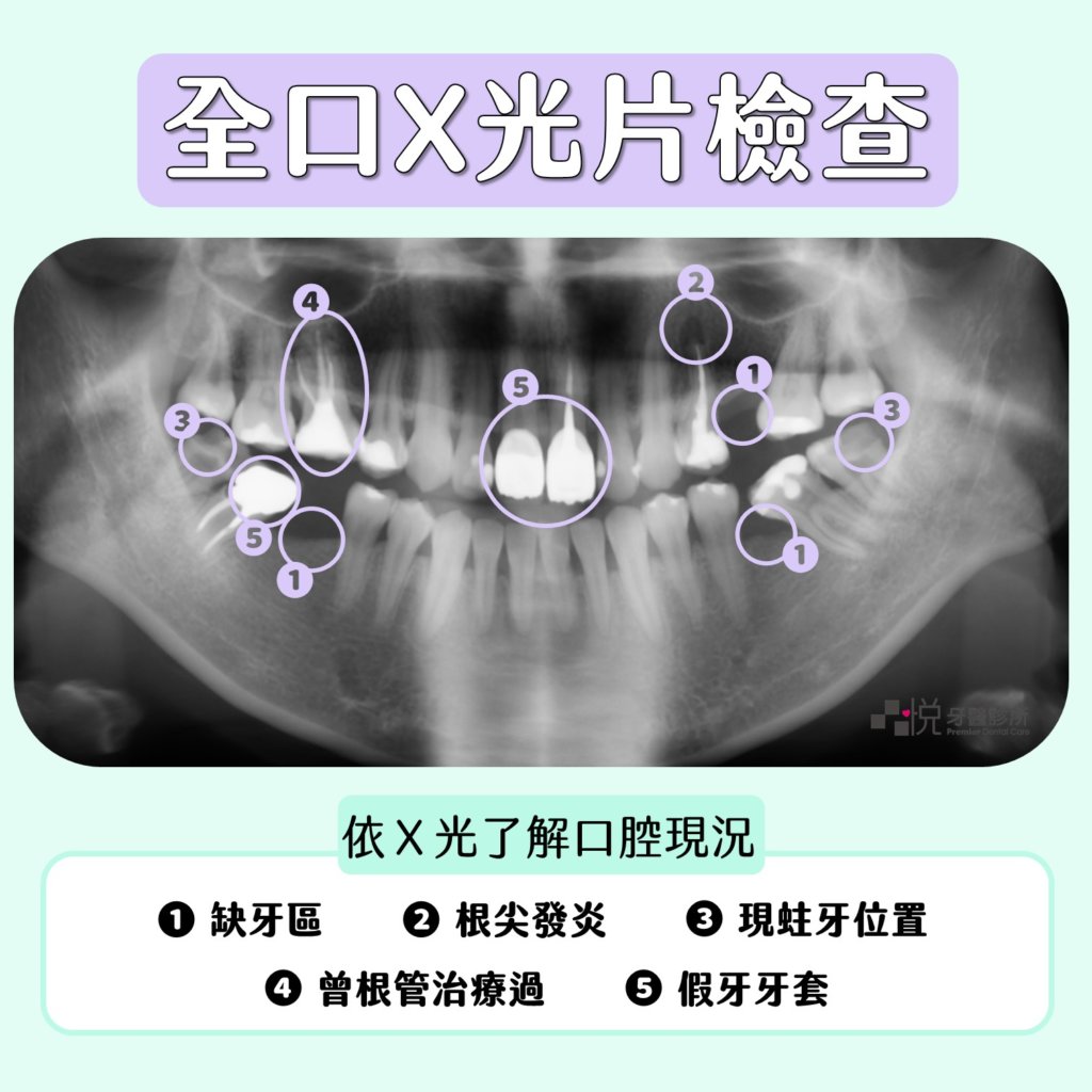 依全口X光片檢查:缺牙、根尖發炎、現蛀牙位置、曾根管治療過、假牙牙套等。