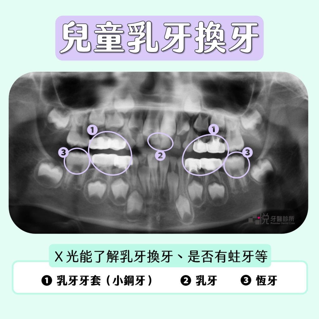 孩子在換牙階段時,醫師能透過X光片來了解孩子的恆牙是否有缺牙、萌發的狀況、乳牙牙根吸收狀態、判斷是否有蛀牙等狀況。