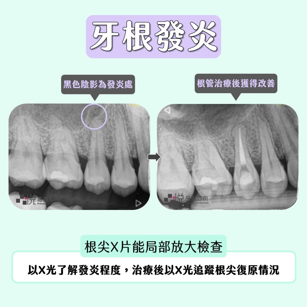 在拍攝局部X光片中看見根尖發炎,能清楚了解根尖發炎程度,並且在根管治療(俗稱抽神經)後,以X光追蹤根尖復原情況。