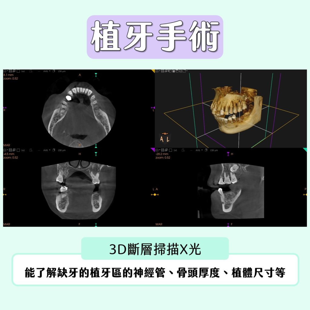 透過3D斷層X光影像,能輔助植牙導航手術、導引手術最佳利器,能更加瞭解預計缺牙/植牙區域、神經管、骨頭厚度偵測、預估合適植體尺寸及位置等。