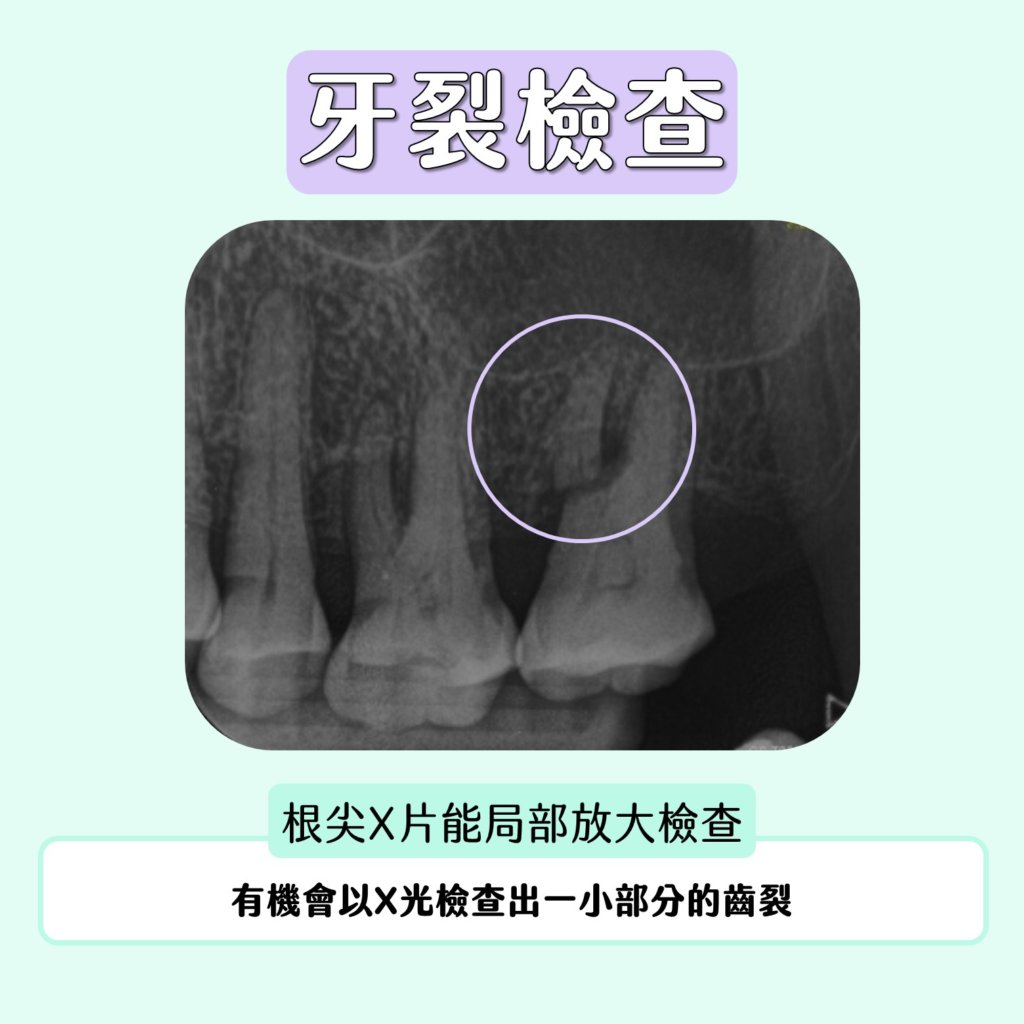 若無法透過單張X片找出裂痕,此時可搭配臨床檢查(例:牙科顯微鏡)問診,加上電腦斷層做輔助診斷。