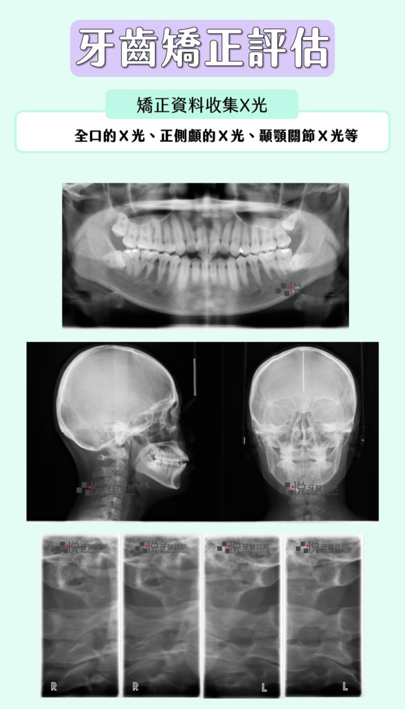 牙齒矯正前的資料收集,會拍攝多種類型的X光片,包含全口的X光、正側顱的X光、顳顎關節X光等,讓矯正醫師有充足的數據分析,進而擬定合適的矯正計畫。
