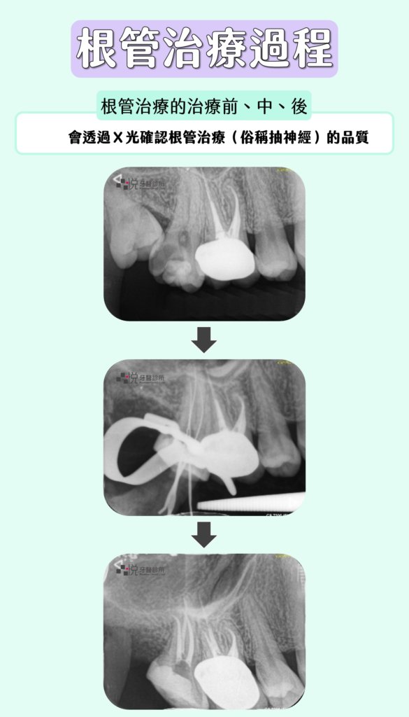 在根管治療(俗稱抽神經)的治療前、中、後,會透過拍攝X光片,以確認根管治療的品質