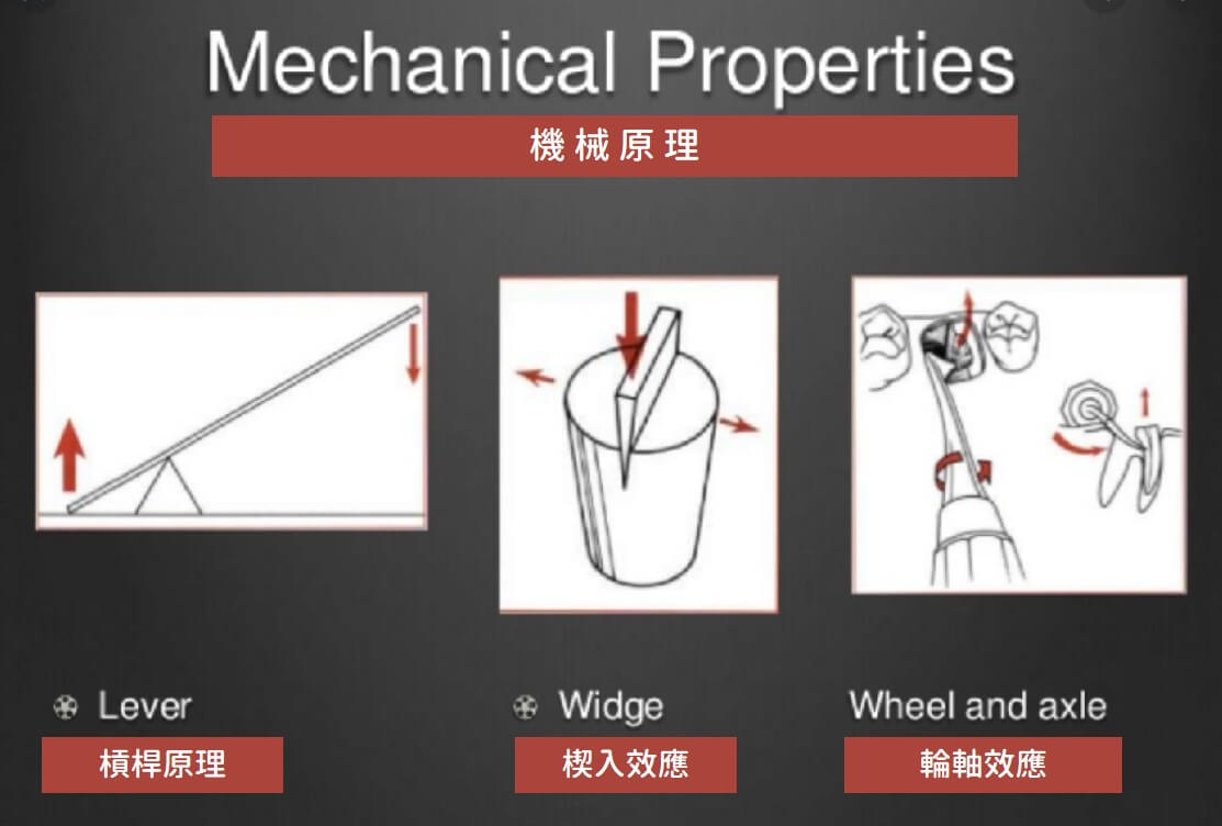 牙齒以牙周韌帶與齒槽骨相連,牙醫師可以利用「槓桿」、「鍥形」、「軸與輪輪」的施力方式,慢慢將牙周韌帶弄鬆、進而弄斷,好將牙齒完整的從齒槽骨內取出。