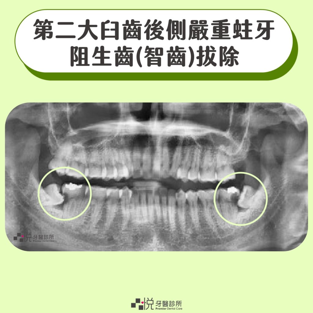 第二大臼齒後側嚴重蛀牙與阻生牙拔除