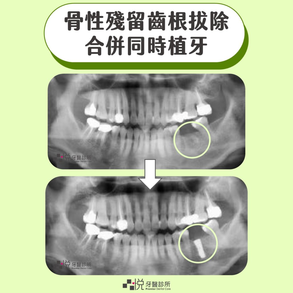 骨性殘留齒根拔除合併同時植牙