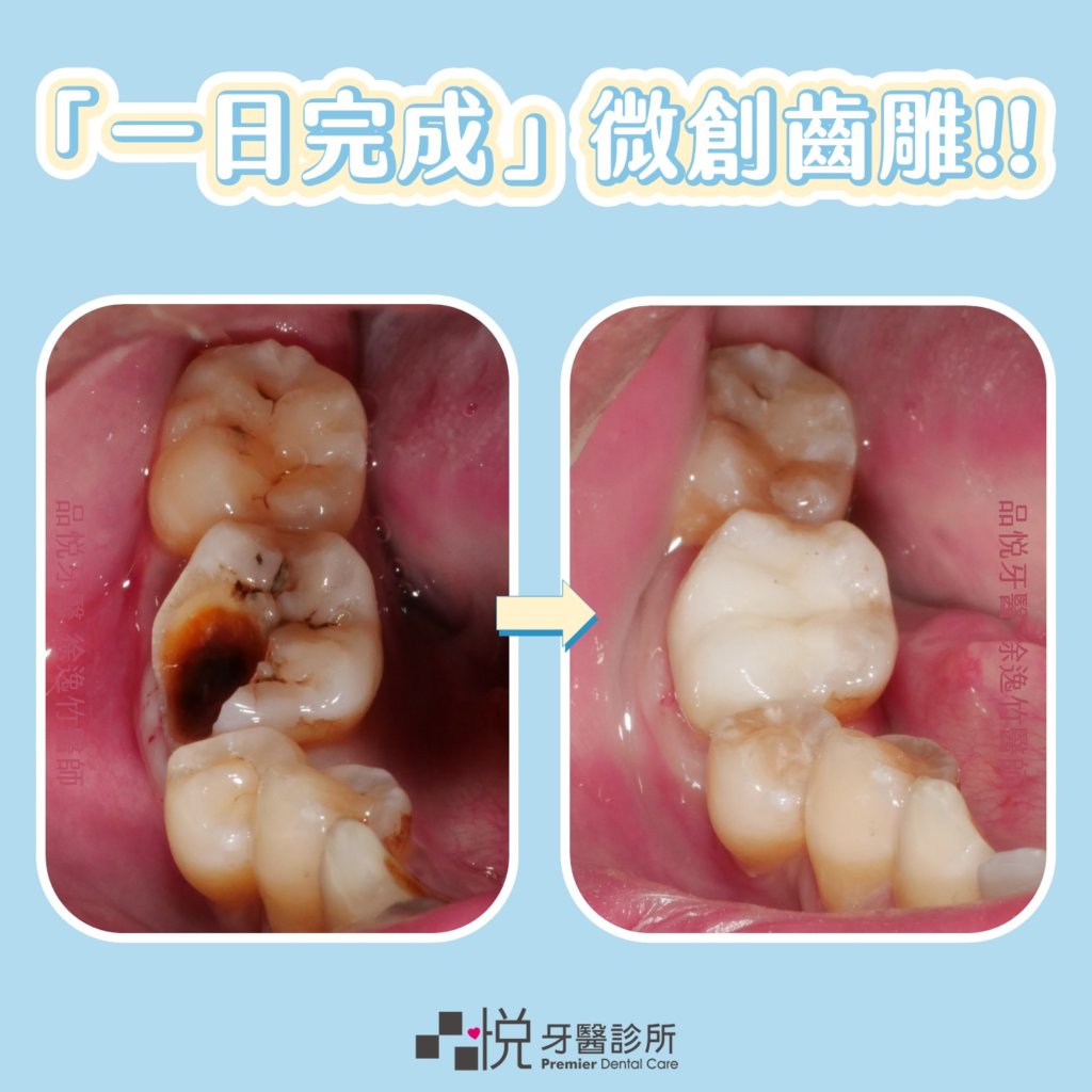 先將嚴重蛀牙治療後,因缺損範圍較大,以「一日完成」微創齒雕