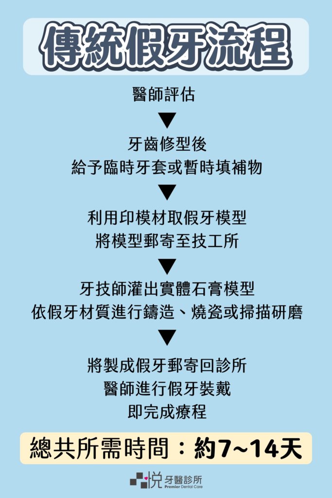 在過去的傳統假牙的流程較為繁瑣,在牙齒修磨後會給予臨時假牙或暫時填補物,後續以印模材料取假牙模型,接著將模型寄出給技工所,再由技師灌出實體石膏模型,依假牙材質進行鑄造、燒瓷或掃描研磨,接著再將假牙寄回診所,期間約需等七到十四天的工作天後,再由醫師進行假牙黏著固定,才算是完成了假牙流程。