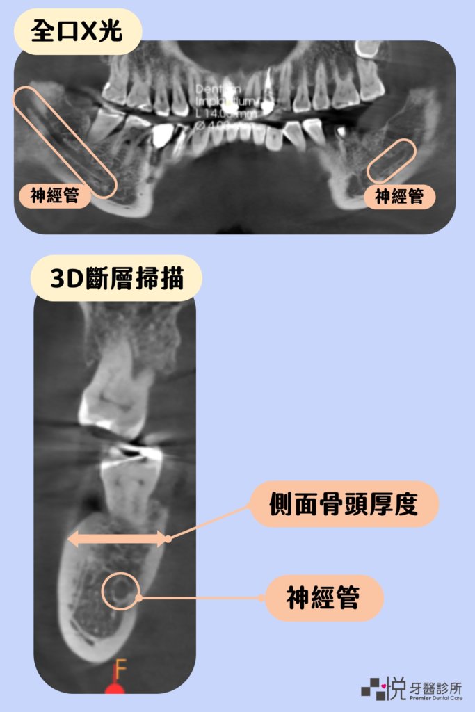 透過全口X光與3D斷層掃描了解口內的狀況(側面骨頭厚度、神經管位置等)