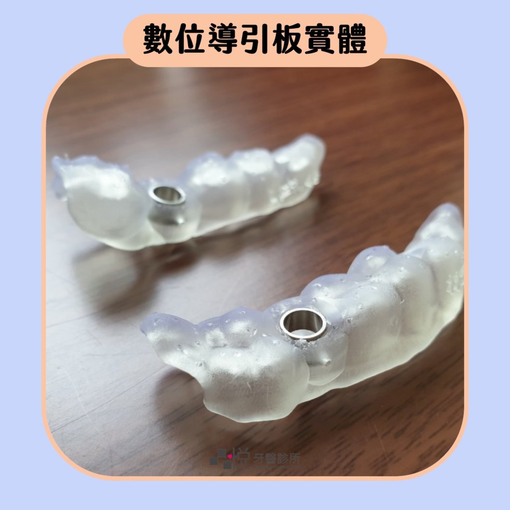 透過導引板協助醫師植牙手術輔助避開患者的神經、血管、上顎竇等解剖構造植體精準定位,且導引板裝置在牙齒上,露出孔洞。