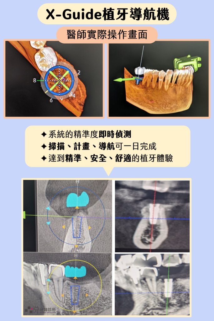 美國最新技術X-Guide是一台醫療用超級電腦,可用於術前診斷和治療計畫,手術中利用光學追蹤,如同GPS導航即時導引器械和人工植牙方向。