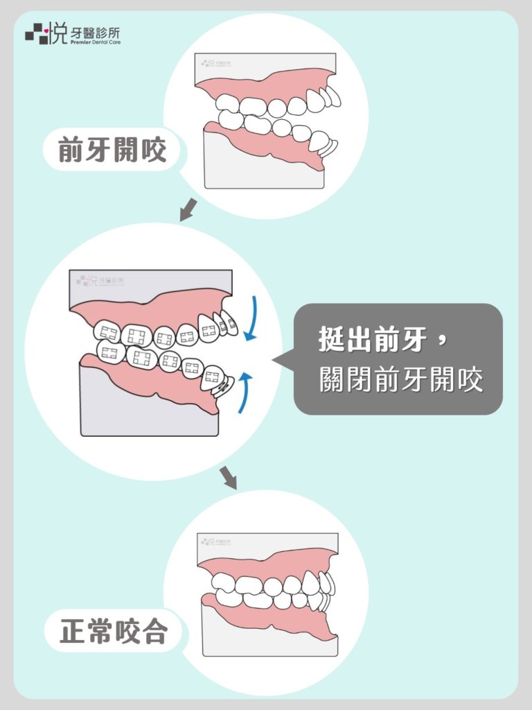 第二種常見的前牙開咬治療方式是是透過牙齒矯正期間,挺出前牙,關閉前牙開咬