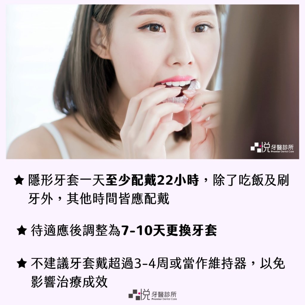 為達有效的牙齒移動,隱形牙套一天之中至少需配戴 22 小時。建議除了吃飯以及刷牙之外,其他時間皆應配戴,才能達到預期中的治療效果。