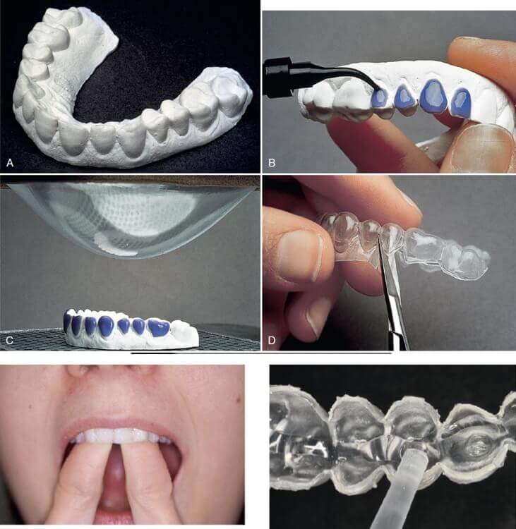 在診所訂製專屬的美白牙托,經由醫師教學與指示,將美白藥劑擠於美白牙托,在每天睡前配戴。