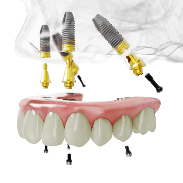All-on-4 全口植牙一日重建,使用特殊植牙設計可一日恢復全口美觀及功能,以較長、較強壯植體增加固持力,搭配斜置植體利用槓桿原理來增加咬合負重能力。