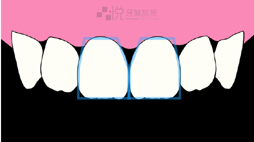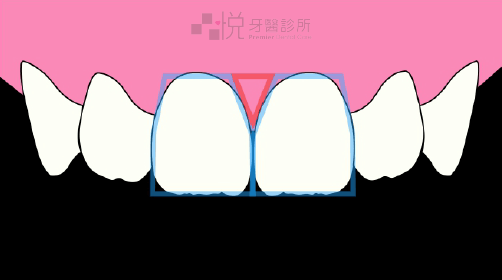 首先是修改牙齒型態,因為兩個牙齒的斜邊越長,三角縫的範圍就會越大,所以只要把牙齒的型態加胖加寬,變成類似兩個長方型並排,就可以有效的減小黑三角縫。
