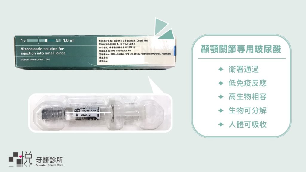 目前市面上有專門為顳顎關節設計的玻尿酸劑型,容量為 1 cc,等同於關節腔的容積,且分子⼤小也與關節潤滑液相似,以增加相容性,故和臉部除皺的玻尿酸不同,不建議交互混⽤。