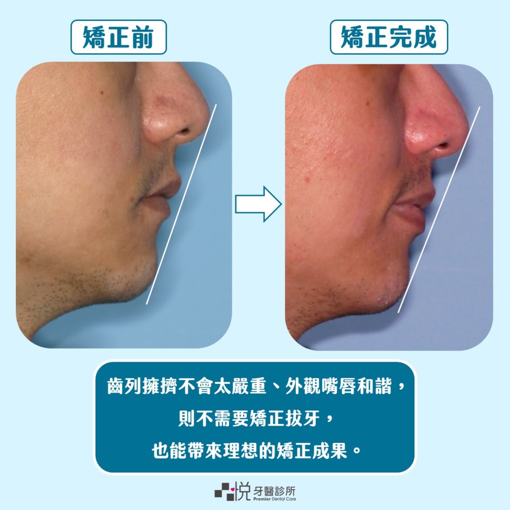 反之,若牙齒擁擠的程度不會太嚴重,外觀嘴唇都很和諧,這種狀況就不需要矯正拔牙,就能帶來理想的矯正成果。