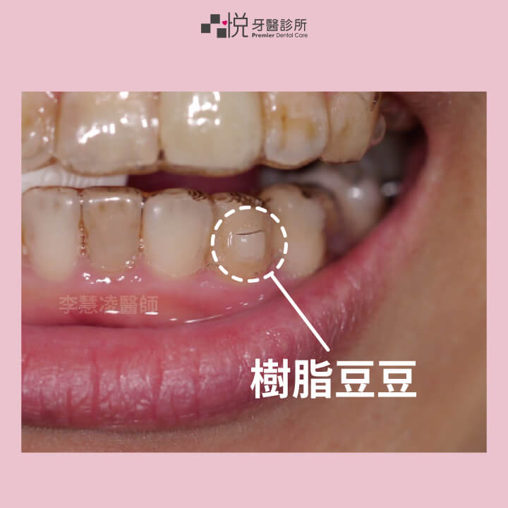 療程中會在牙齒上黏上樹脂豆豆達到完整的牙齒移動,如果隱適美豆豆掉了,請盡快與您的矯正醫師聯絡後安排重新黏隱適美豆豆的時間。但是樹脂豆豆因為體積較小,脫落的機率也比傳統的矯正器低了許多。