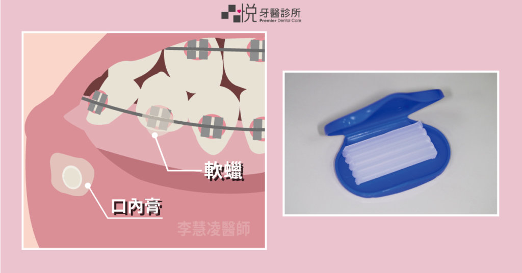 一般針對這種情況,診所會提供軟蠟和口內膏來緩解不適。可將軟蠟暫時貼在矯正器上,減少和口腔黏膜摩擦導致潰瘍的狀況,用以減少不適感。口內膏則用來塗抹口腔內傷口表面上,有效舒緩口腔黏膜破損。