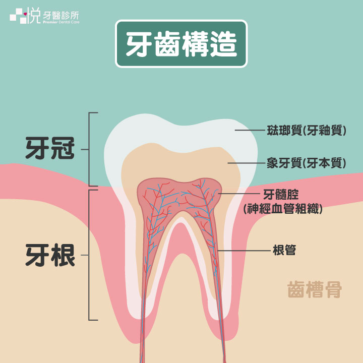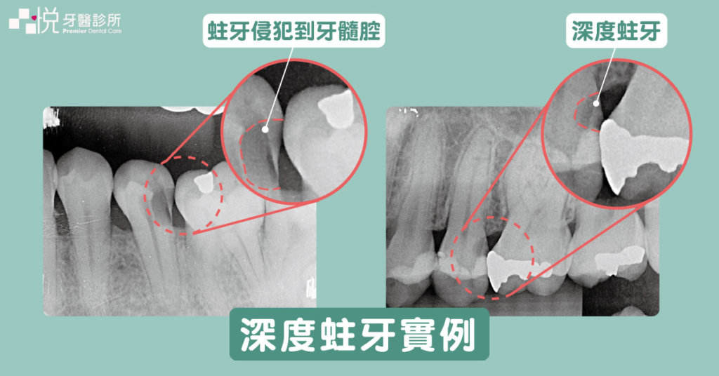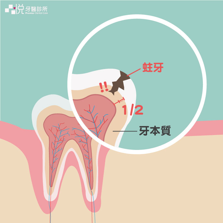 牙齒的結構由外而內依序是最堅硬的琺瑯質➔充滿孔洞的牙本質➔最內富含有神經的牙髓腔。當造成齲齒的細菌突破最堅硬的琺瑯質後,就會在牙本質快速的擴散。當細菌擴散超過1/2牙本質厚度就算是深度齲齒。隨著細菌越接近牙髓腔,牙髓就會開始發炎。