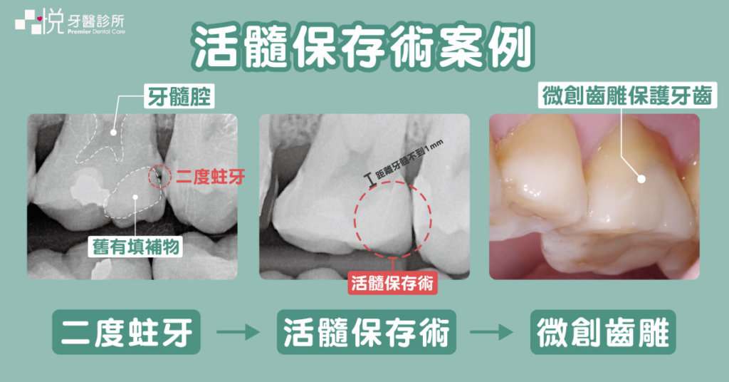 隨著材料與牙科技術的進步,以前深度蛀牙或有牙髓炎的牙齒只能進行「根管治療」與「假牙」保護。現在多了「活髓保存」與「微創齒雕」這兩個新的技術選項,讓我們多給牙齒一些健康的機會,延緩牙齒壽命的歷程。