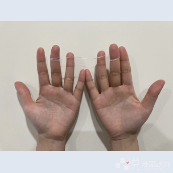 手比兩個「7」留下大約兩個大拇指長度的牙線於中間。
