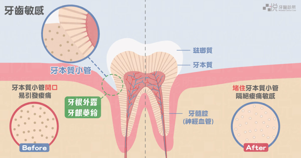 圖為說明引起敏感性牙齒的可能因素與緩解方法。