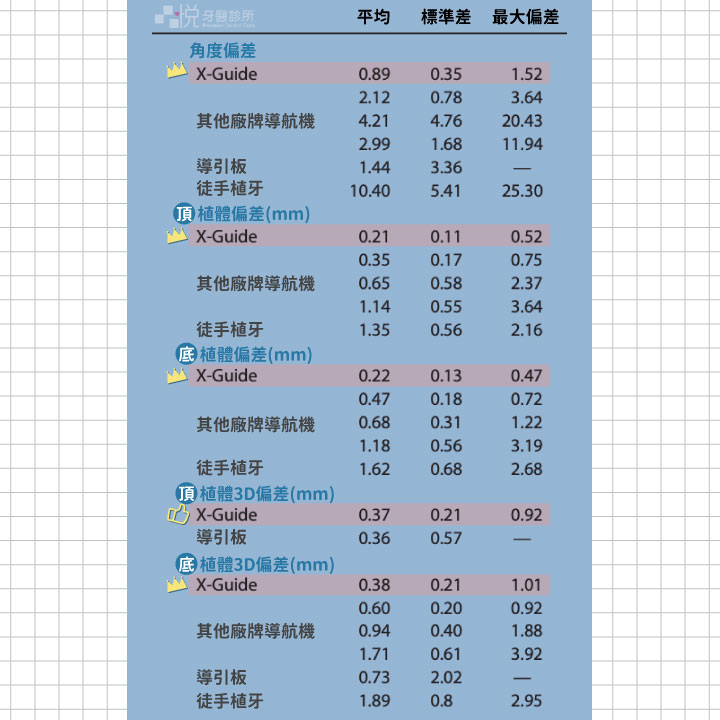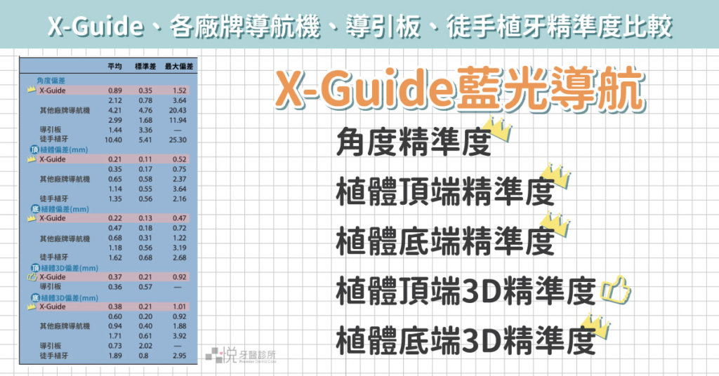 目前品悅牙醫診所採用「X-Guide藍光導航」及「導引板」兩種不同的技術,經過研究證實,精準度是「X-Guide藍光導航」 > 「導引板」 > 「醫師徒手校正」。可以觀看圖表。此外這部分也有本院所張志嘉醫師詳細的介紹,可以觀看以下影片喔。