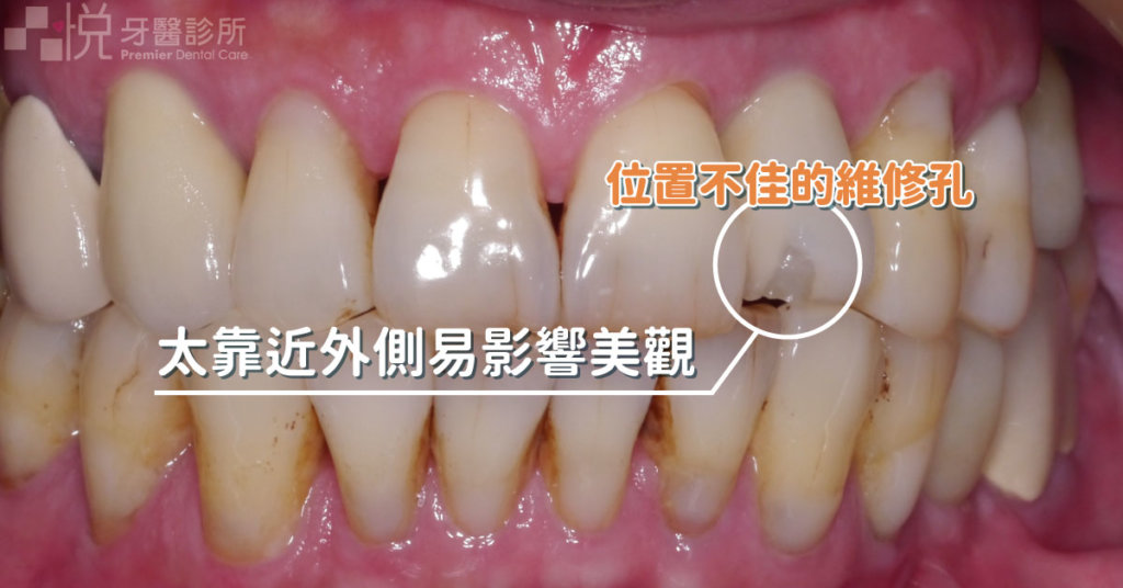 - 維修孔用補牙材料填起來,仍會有些許色差。在前牙通常是看不見維修孔的,但在後牙會看到,如圖示。