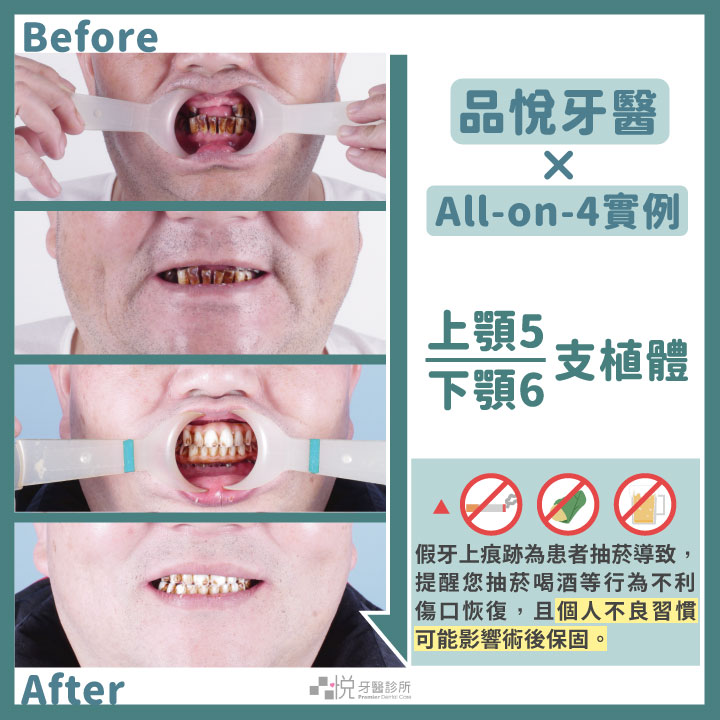 患者上下顎皆有接受 All-on-4 治療,張志嘉醫師提醒您個人不良習慣可能會影響術後恢復。