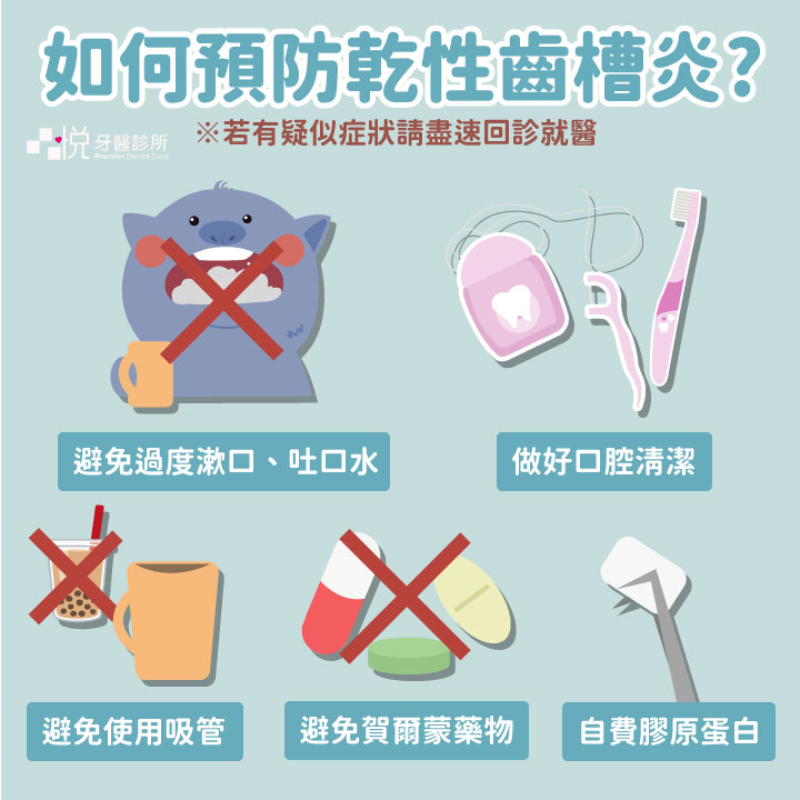 一般拔牙手術後診所都會進行基本的衛教如請不要用力漱口、避免使用吸管等等,但若擔心乾性齒槽炎的發生,也可以跟醫師要求在傷口放置膠原蛋白讓傷口更不易暴露。