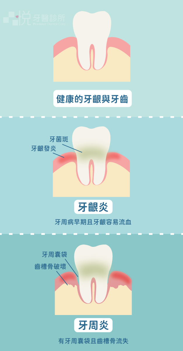 但因牙齦炎時常沒有症狀,因此很多人會錯過處理時機,等釀病且發炎已經影響到支撐牙根周圍的齒槽骨時,我們會稱之為牙周炎。