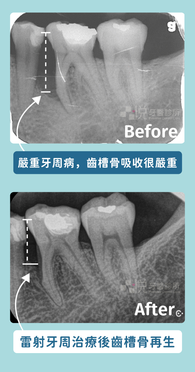可以更微創的方式,提高牙周再生的機率。以往齒槽骨的再生多半需要牙周手術的方式(如翻開牙肉、放入骨粉)比較有辦法達成,但使用雷射來做牙周治療後,我們會時常觀察到不用手術也有不錯的齒槽骨再生的效果。