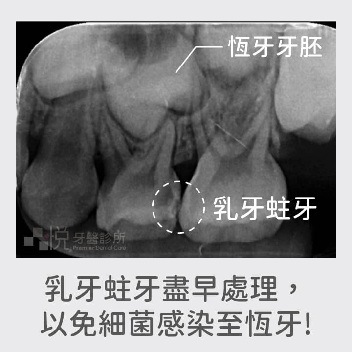 - 恆牙牙胚在乳牙底下,乳牙蛀牙導致恆牙可能長出來就有蛀牙