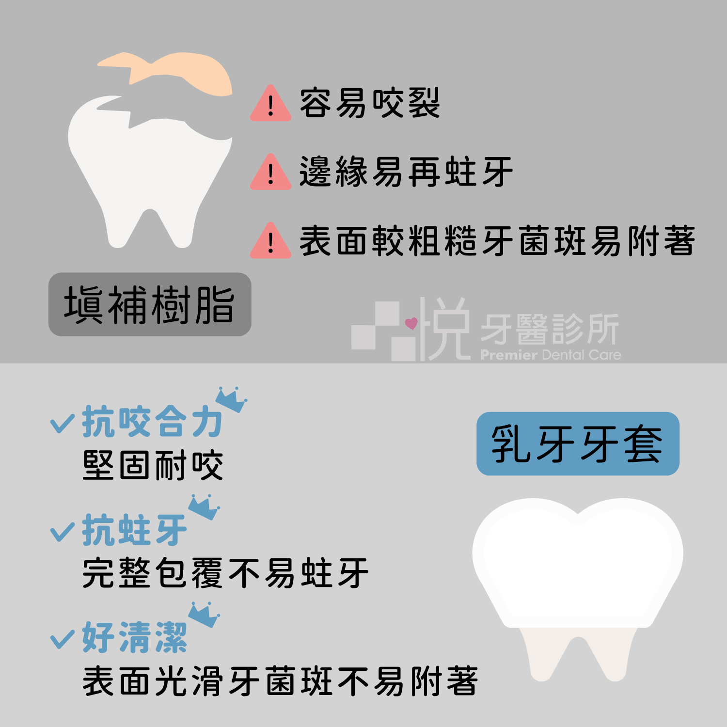 說明 | *小孩配合度較低也可進行 | * 條件較嚴,小孩需配合度高 *適合根管治療後的牙齒 |