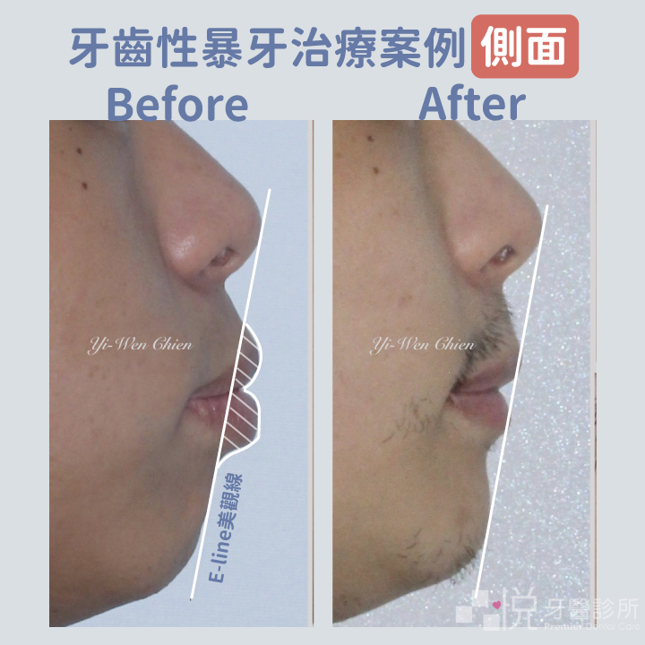 1. 側臉輪廓上下嘴唇突出於美觀線 ( E-line:從鼻尖到下巴最突點的連線 ) 之外。