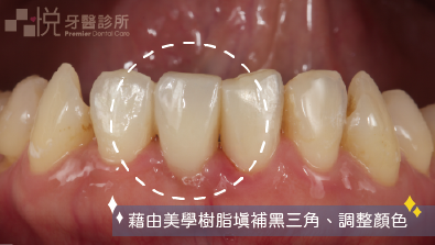 沒關係,我們藉由美學樹脂填補的方式,不只縮小了黑三角縫,也修正了舊有填補物顏色稍為沒那麼理想的小缺憾。