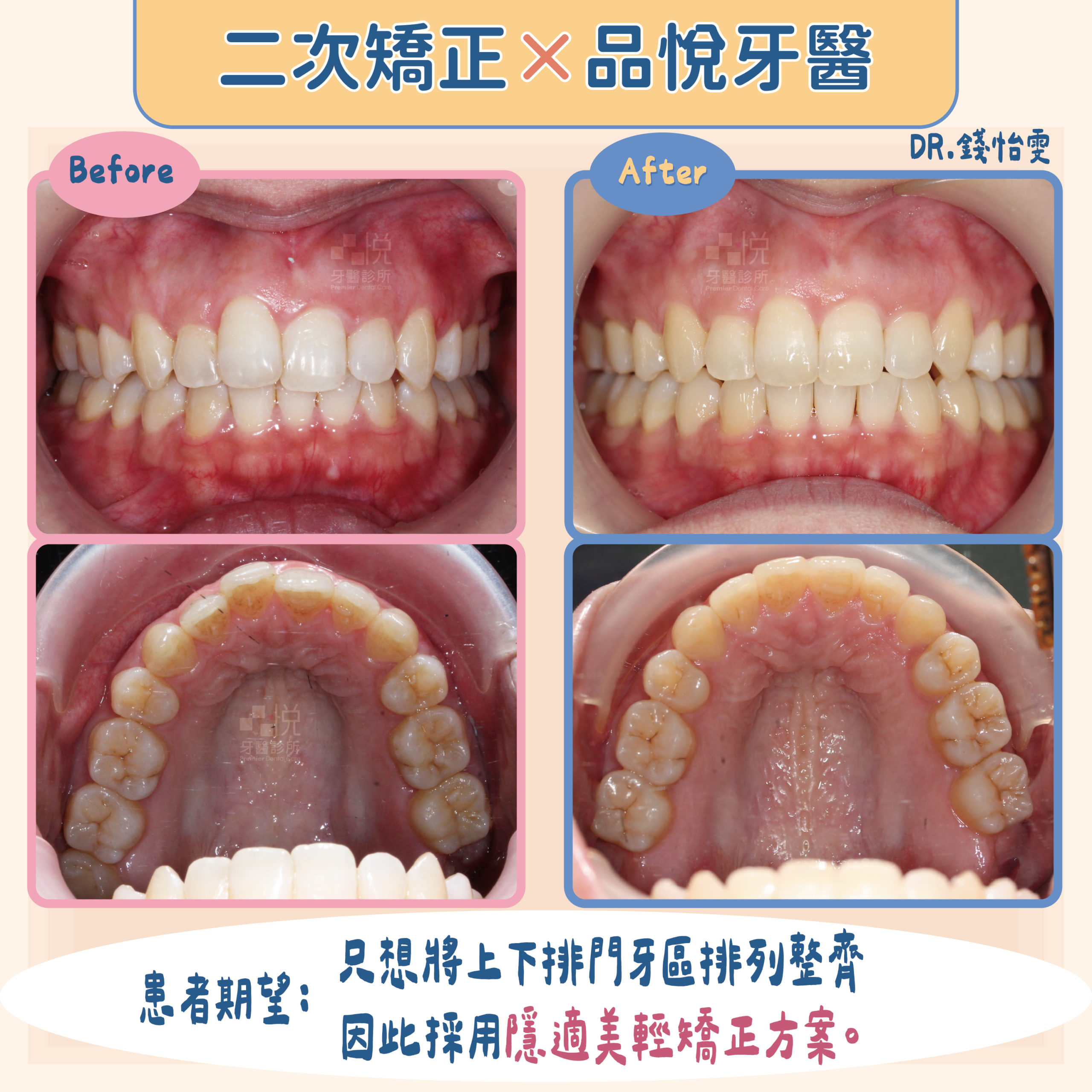 下圖為二次矯正案例,患者說明上顎和下顎門牙排列不整齊,只想將上下門牙區排列整齊,不想大幅度更動中線和咬合。