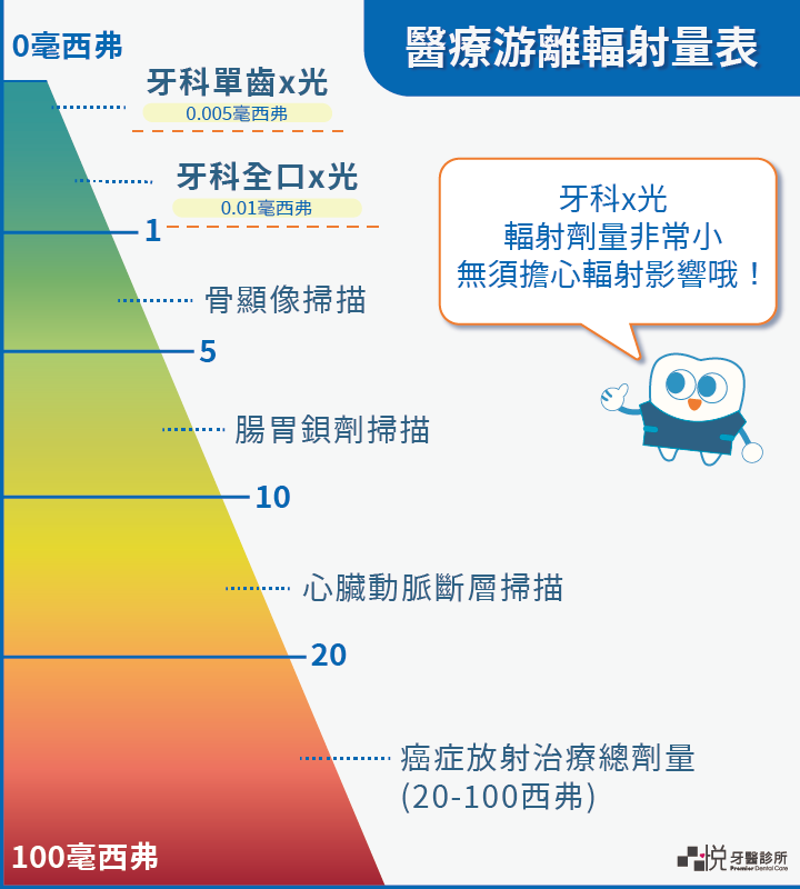 封填完成後也要確認封填材料的長度和緻密度,因此術後也會要再拍 X 光片。牙科的 X 光片劑量真的非常非常小,真的無需太害怕輻射影響唷!一起附上劑量表讓大家參考。