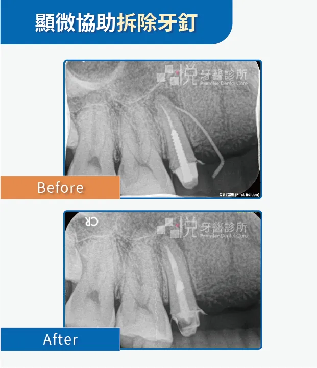 當牙齒齒質較少時,以顯微鏡的輔助來拆除牙釘,以避免損耗過多齒質及牙齒斷裂。