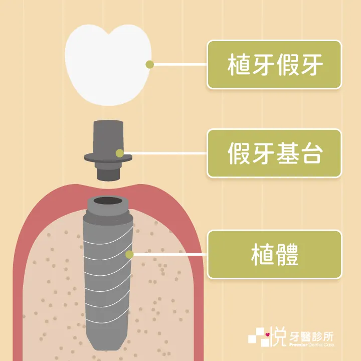 - 植體:埋在骨頭裡的人工牙根。